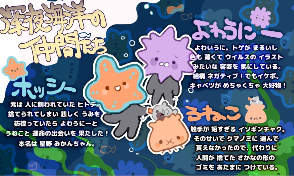 • ホッシーは元ペットのヒトデ。思ったことはすぐ言うタイプ。本名は星野みかんで、これは元の飼い主につけてもらった名前です。