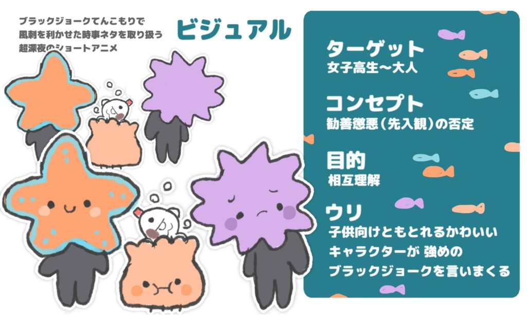 • コンセプト:勧善懲悪の否定。勧善懲悪とは、正義が勝ち、悪が負けること。これは人間が持つ先入観だと思っています。ホッシー達は思うままの自由な発言で固定観念を崩していきます。