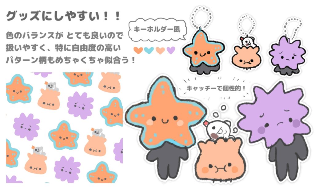 キャラクターを海の生き物にした理由は、海という人と違う世界に住む生き物を取り扱うことにより、先入観をとりはらった表現をしやすくなるからです。メジャーなさかなではない生物にしたことで、より個性的でキャッチーな印象です。その他にこだわったことは、パターン風に並べたときにきれいに見える配色です。色の組み合わせが良いとグッズにもしやすいです。